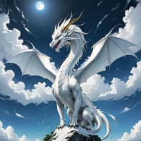 На картинке величественный дракон восседает на вершине скалы. У него огромные, мощные крылья, широко расправленные. Тело его изогнуто и мускулисто, а чешуя блестит в лунном свете. Хвост плавно покачивается в воздухе, словно подхваченный легким ветерком. На заднем плане – спокойное ночное небо, полное облаков. Полная луна висит низко над горизонтом, заливая сцену мистическим светом. Внизу, под драконом, вода отражает небесное великолепие, добавляя картинке ощущение умиротворения.