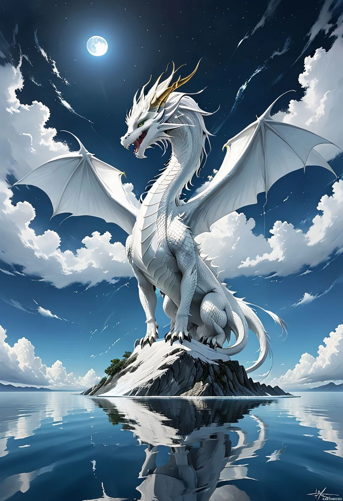 The image features a majestic dragon perched atop a rocky outcrop. The dragon has large, powerful wings that are spread wide. Its body is coiled and muscular, with scales glistening in the moonlight. Its tail swishes in the air as if caught in the breeze. The background paints a serene night sky filled with clouds. A full moon hangs low on the horizon, casting an ethereal light over the scene. Below the dragon, the water reflects the celestial display above, adding a sense of tranquility to the image.