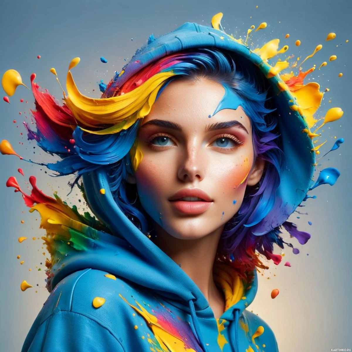 На картинке изображена женщина в профиль. У нее многоцветные волосы с прядями фиолетового, синего и жёлтого цветов. Макияж яркий, с розовыми и синими оттенками вокруг глаз и на щеках. Выражение лица нейтральное. На ней накинут толстовка с капюшоном. Вокруг женщины – взрыв разноцветной краски, разлетающейся во все стороны, преимущественно вниз. В краске присутствуют красный, оранжевый, жёлтый, зелёный, синий и розовый цвета. Брызги краски наиболее густые внизу и постепенно уменьшаются по мере движения вверх. Фоном служит тёмно-серый фон, который контрастирует с яркими оттенками краски и усиливает визуальное воздействие картинки. Общий стиль фотографии – художественный, возможно, предназначенный для творческих или модных целей.