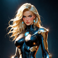 На картинке изображена героиня в футуристических, высокотехнологичных доспехах сине-золотого цвета. Доспехи облегающие, сочетают в себе функциональность и эстетику. У неё волнистые волосы и светлая кожа. На заднем плане – научно-фантастический пейзаж со звёздным небом или космической сценой, освещённой, кажется, отблесками света.