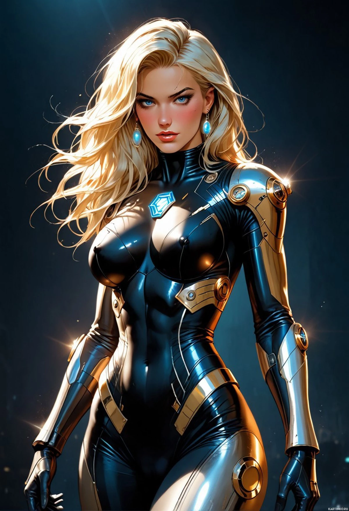 The image depicts a female character dressed in futuristic, high-tech armor with a blue and gold color scheme. The armor appears to be form-fitting and designed for functionality as well as aesthetics. Her hair is styled in loose waves and she has fair skin. The background suggests a science fiction setting with a starry sky or space scene, illuminated by what looks like light reflections.