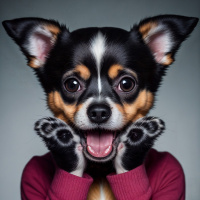 На картинке изображен маленький чихуахуа с черно-белой шерстью, сидящий на фоне нейтрального цвета. У собаки открыт рот, будто она улыбается или тяжело дышит. Уши торчком, глаза смотрят прямо в камеру. По бокам мордочки лапки приподняты у груди, что придает ему игривый и взволнованный вид. На шее у собаки красный ошейник с белыми пятнышками. Фотография снята крупным планом, похоже, в студийных условиях, так как на заднем плане нет посторонних предметов или отвлекающих деталей.