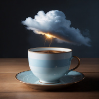 In the center of a dark background, there's a coffee cup placed on a saucer with gold trim. The coffee cup is white and has a blue handle. Directly above the coffee cup, there are large clouds that appear to be electrified due to lightning bolts striking them. This creates an image of a cup of coffee being served during a thunderstorm.