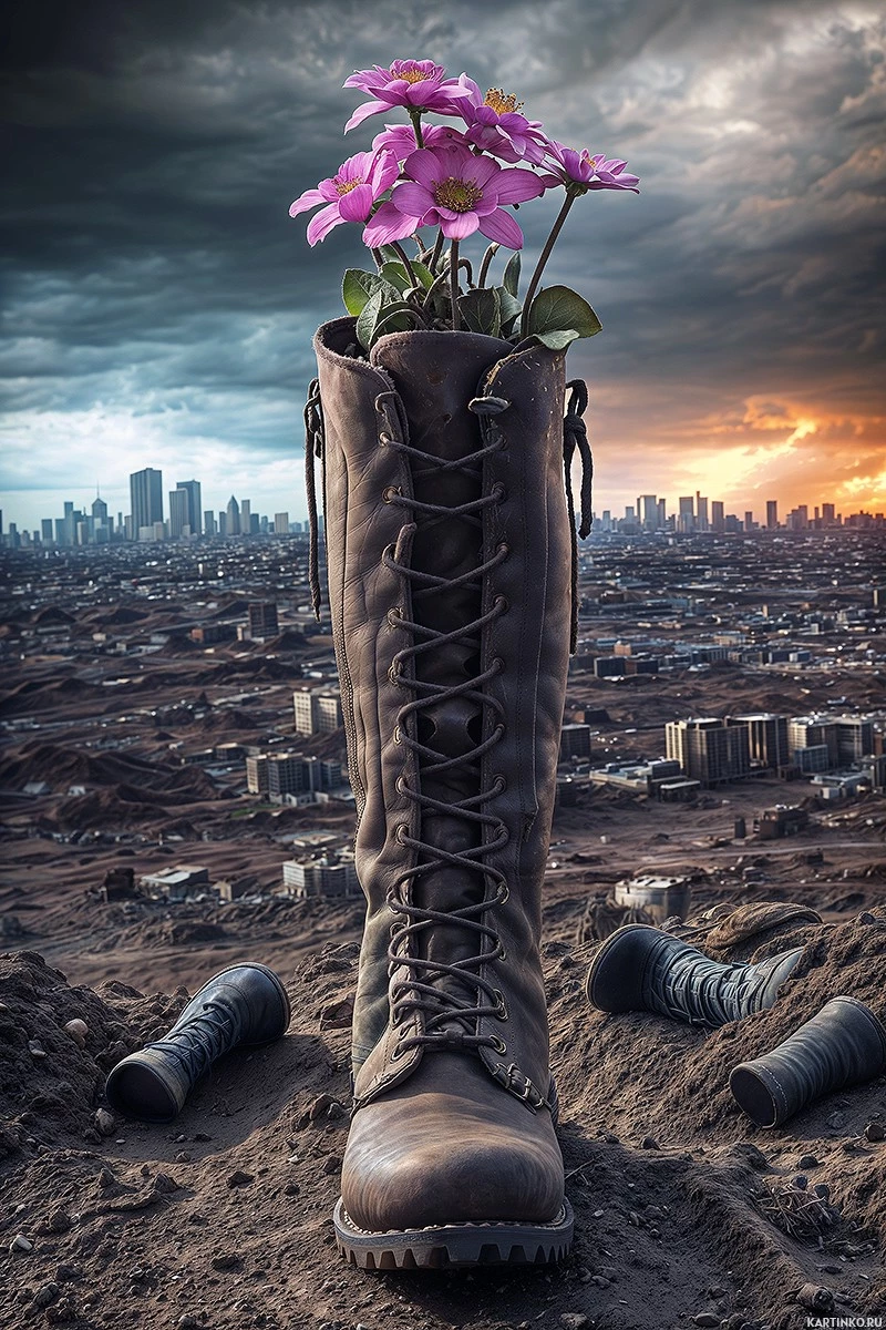 На картинке изображена постапокалиптическая сцена: одинокий ботинок стоит на груде обломков. Внутри этого ботинка расцвел яркий фиолетовый цветок, символизирующий жизнь в безжизненном пейзаже. На заднем плане виден силуэт городского пейзажа на фоне драматичного неба, освещенного мягким светом восхода или заката. Этот контраст между цветущим цветком и заброшенным ботинком олицетворяет стойкость и жизнь, возникшую среди разрушений.