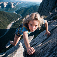 In the image, a young blonde girl with a blue backpack and safety harness is climbing up the side of a mountain. She appears to be midway through her ascent on a rocky terrain, with lush green trees scattered below. The sky above suggests it's either early morning or late afternoon due to the soft lighting.