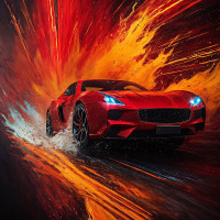 The image depicts a high-performance red sports car in motion on what appears to be a race track with a blurred background suggesting speed. The car is characterized by its sleek design, wide stance, and prominent front grille with the emblem of a horse, which is characteristic of the Maserati brand. The vehicle's headlights are on, emphasizing the dynamic nature of the scene. Splashes of vibrant red and orange paint are scattered throughout the background, adding to the sense of speed and intensity associated with high-performance vehicles. The style of the image is akin to digital art or promotional material for automobiles, aiming to capture the essence of luxury and performance.