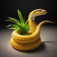 На картинке изобращена скульптура змеи с проработанной текстурой чешуи, придающей ей реалистичный вид. Она застыла в настороженной позе и держит в пасти лист растения. Фон нейтральный, чтобы акцентировать внимание на самой скульптуре змеи.