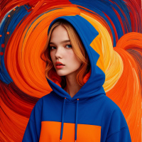 На картинке – девушка с светлыми волосами, снятая в профиль на фоне яркого фона. На ней оранжевый и синий худи, который контрастирует с её спокойным выражением лица. Фон представляет собой крупную, разбрызганную картину, в основном в красных и синих тонах, создающую эффектный визуальный акцент вокруг модели.