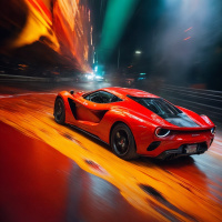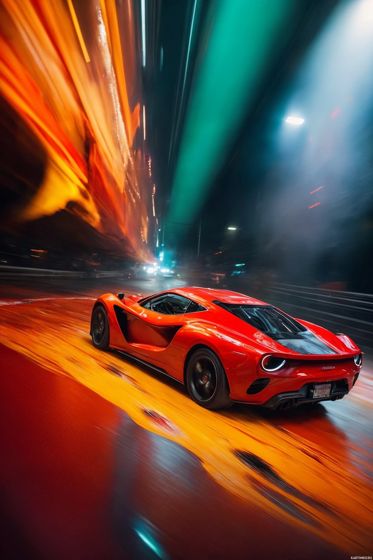The image depicts a dynamic scene featuring a red sports car captured in motion on what appears to be an urban street at night. The lights of the city are streaked in vibrant hues, predominantly blues and reds, suggesting high speeds or movement blur, which is often used in photography and filmmaking to convey action. The vehicle has a sleek design typical of modern sports cars with aerodynamic features such as air intakes and a rear spoiler. It also exhibits the characteristic headlights and emblems that are associated with high-performance vehicles. The overall style of the image is stylized and dramatic, employing visual effects to give a sense of speed and intensity to the scene.