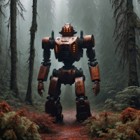 На картинке изобранена фантастическая сцена, действие которой разворачивается в лесу. В центре стоит оранжевый робот с множеством шарнирных конечностей и головой, напоминающей лицо с глазами и ртом. Робота окружает густая растительность, включая высокие деревья с мшистыми стволами и папоротникообразными растениями. Освещение указывает на раннее утро или поздний вечер, с мягким светом, пробивающимся сквозь крону.