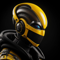 a yellow helmet with a black visor, giving it a menacing appearance. It has