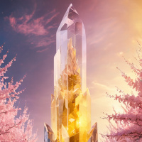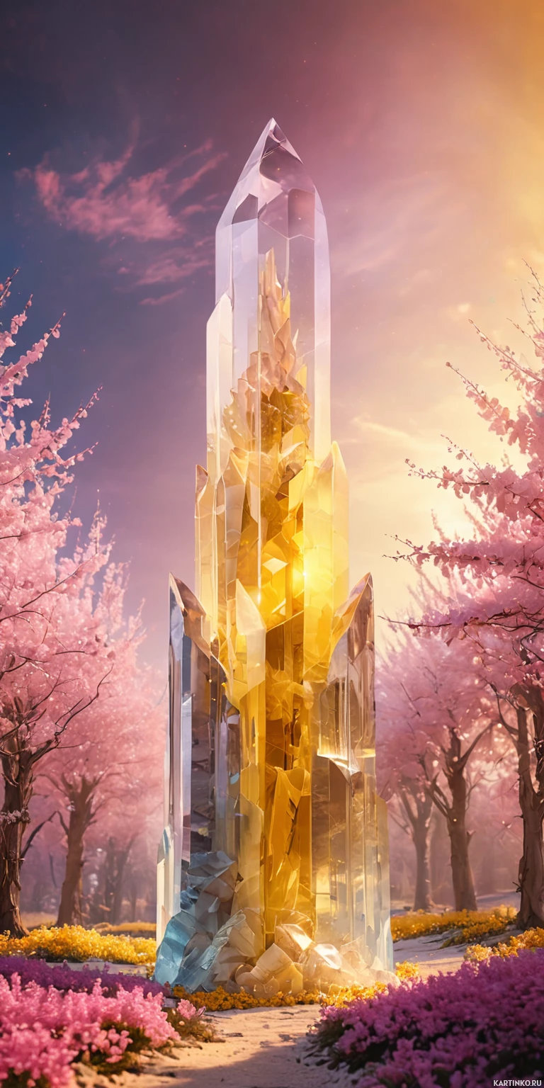 a fantastical scene with a prominent crystal structure at its center. This crystal is composed of