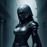 The image shows a character dressed in armor and a helmet that conceals her face, giving her an anonymous appearance. She has shoulder guards and is wearing a breastplate, suggesting she might be portraying a warrior or a superhero-like persona. Her attire is dark with metallic details. The setting appears to be an urban alleyway, which adds a gritty and dramatic effect to the scene.