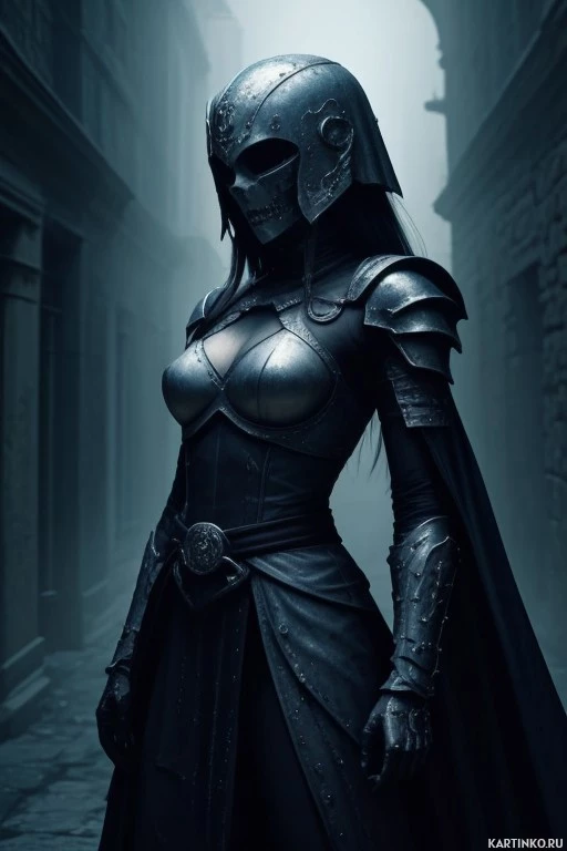 На картинке изображена героиня в доспехах и шлеме, скрывающем лицо, что придает ей загадочный вид. На ней наплечники и нагрудник, что позволяет предположить, что она играет роль воительницы или персонажа, похожего на супергероя. Её костюм темный, с металлическими акцентами. Задний план – городской переулок, создающий мрачную и драматичную атмосферу.