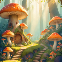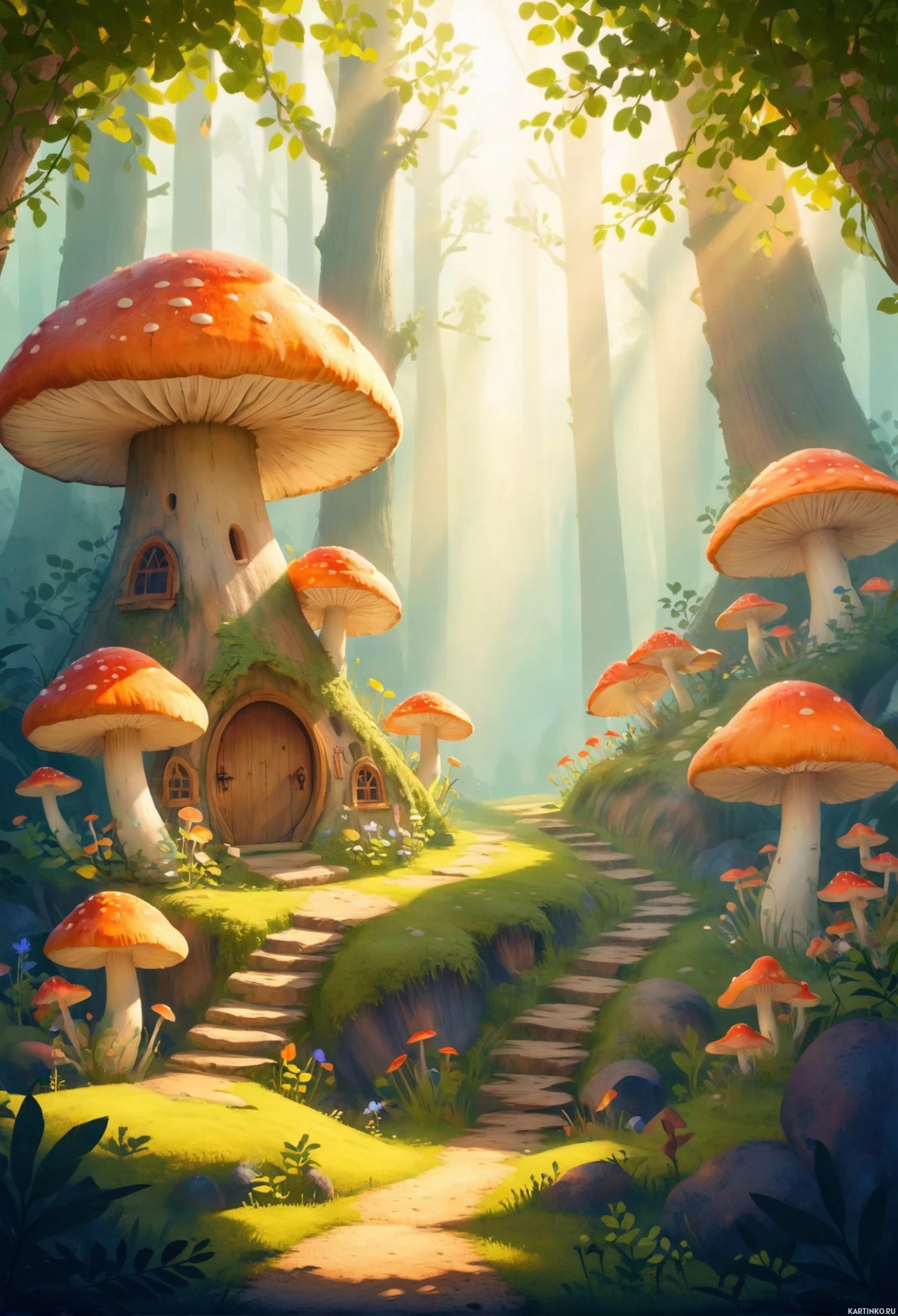 a small house with an arched doorway, nestled amidst a copse of mushrooms. Some of these mushrooms are large and tower over the structure, while others are smaller and scattered around it. The ground is covered in what appears to be clover or similar foliage, adding to