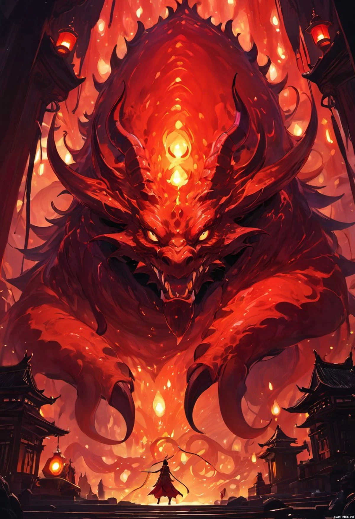 Картинка изображает фантастическую сцену с огромным красным демоном, покрытым множеством рогов и острых когтей, грозно возвышающимся на переднем плане. Его огненно-красная кожа словно состоит из пламени. Перед этим существом стоит одинокая фигура, похожая на человека, одетого в темную одежду, с вызовом смотрящая на огромного монстра. На заднем плане – хаотичная картина разрушений и отчаяния. Здания рушатся под тяжестью огненного неба, заполненного красными и оранжевыми языками пламени, словно падающими из правого верхнего угла картинки. В левом нижнем углу видна темная аллея или улица, ведущая к демону и стоящему перед ним человеку. Стиль рисунка наводит на мысль о связи с видеоиграми или фэнтезийной литературой, благодаря детализированным персонажам и динамичной, насыщенной действием композиции.