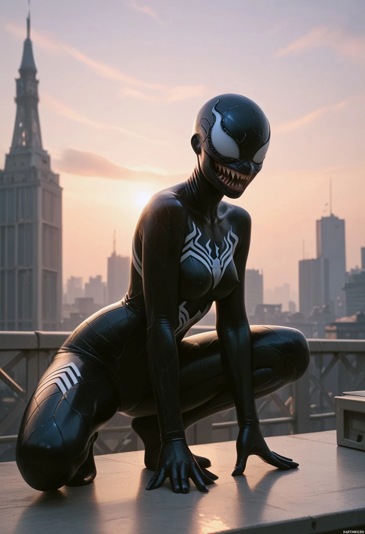 На картинке человек присел на выступе, с которого открывается вид на городской пейзаж на закате. На нём чёрный комбинезон с белыми пятнами и капюшон, напоминающий костюм персонажа, похожего на Человека-паука, хотя отсутствие каких-либо надписей или логотипов не позволяет точно сказать, связан ли это с ним или с другим супергероем. У человека искажённое выражение лица, добавляющее сюрреалистический или даже жутковатый оттенок к картинке. На заднем плане – многоэтажные здания на фоне оранжевого неба, что указывает на закат.