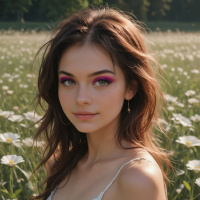 In the image, a young woman is standing in a field of flowers. She has short brown hair and her makeup includes subtle purple eyeshadow and soft pink lipstick. The woman is wearing a sheer white top with thin straps over a crop-style tank top. Her gaze is directed towards the camera, giving a sense of engagement with the viewer. Behind her, the field is filled with white daisies, creating a backdrop that suggests a serene and natural setting.