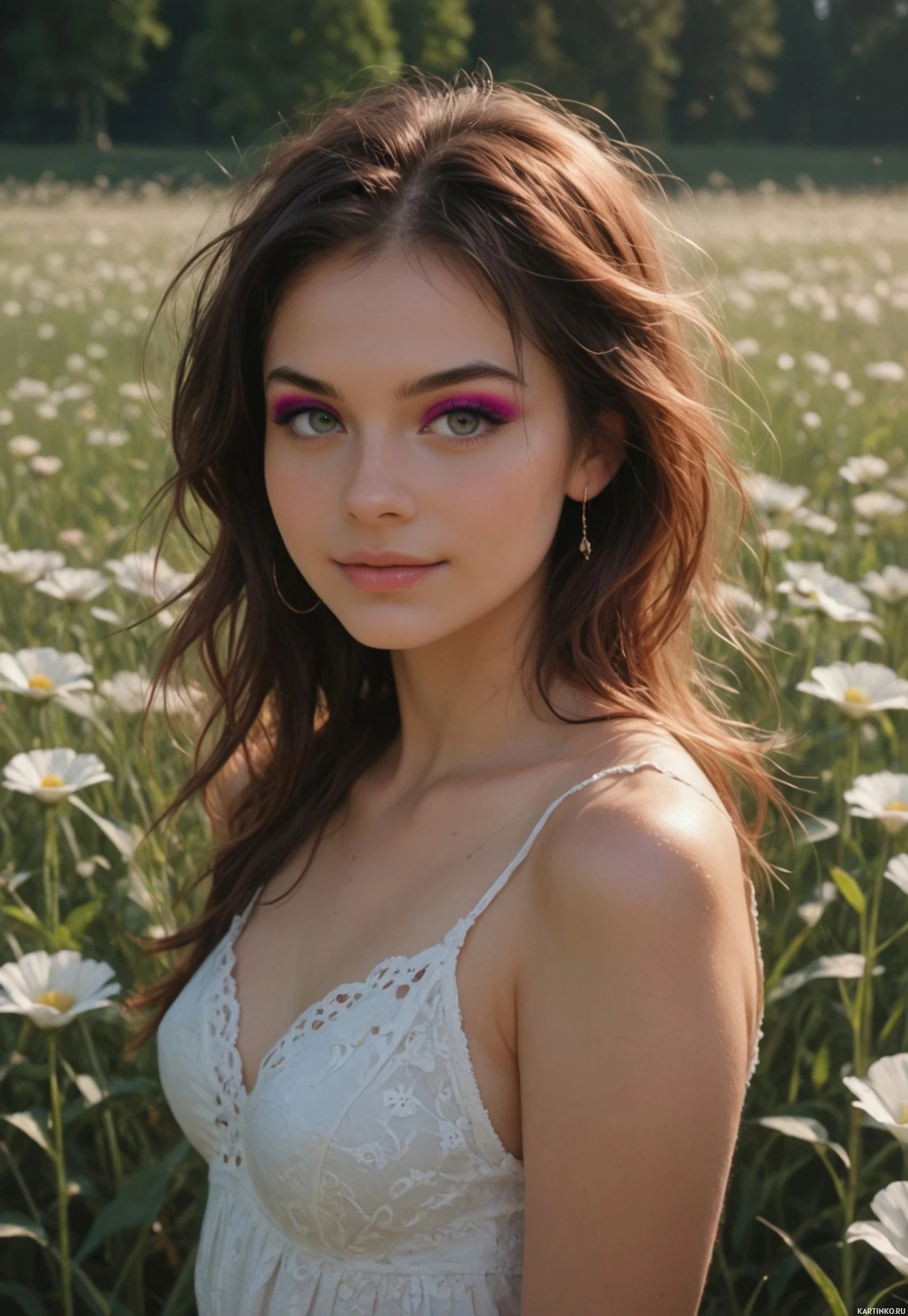 На картинке молодая женщина стоит на поле цветов. У неё короткие каштановые волосы, а макияж включает нежные фиолетовые тени и нежно-розовый блеск для губ. На ней прозрачная белая блузка с тонкими бретельками поверх топа в спортивном стиле. Она смотрит прямо в камеру, создавая ощущение вовлечённости. За ней простирается поле белых ромашек, создающее спокойную и естественную обстановку.
