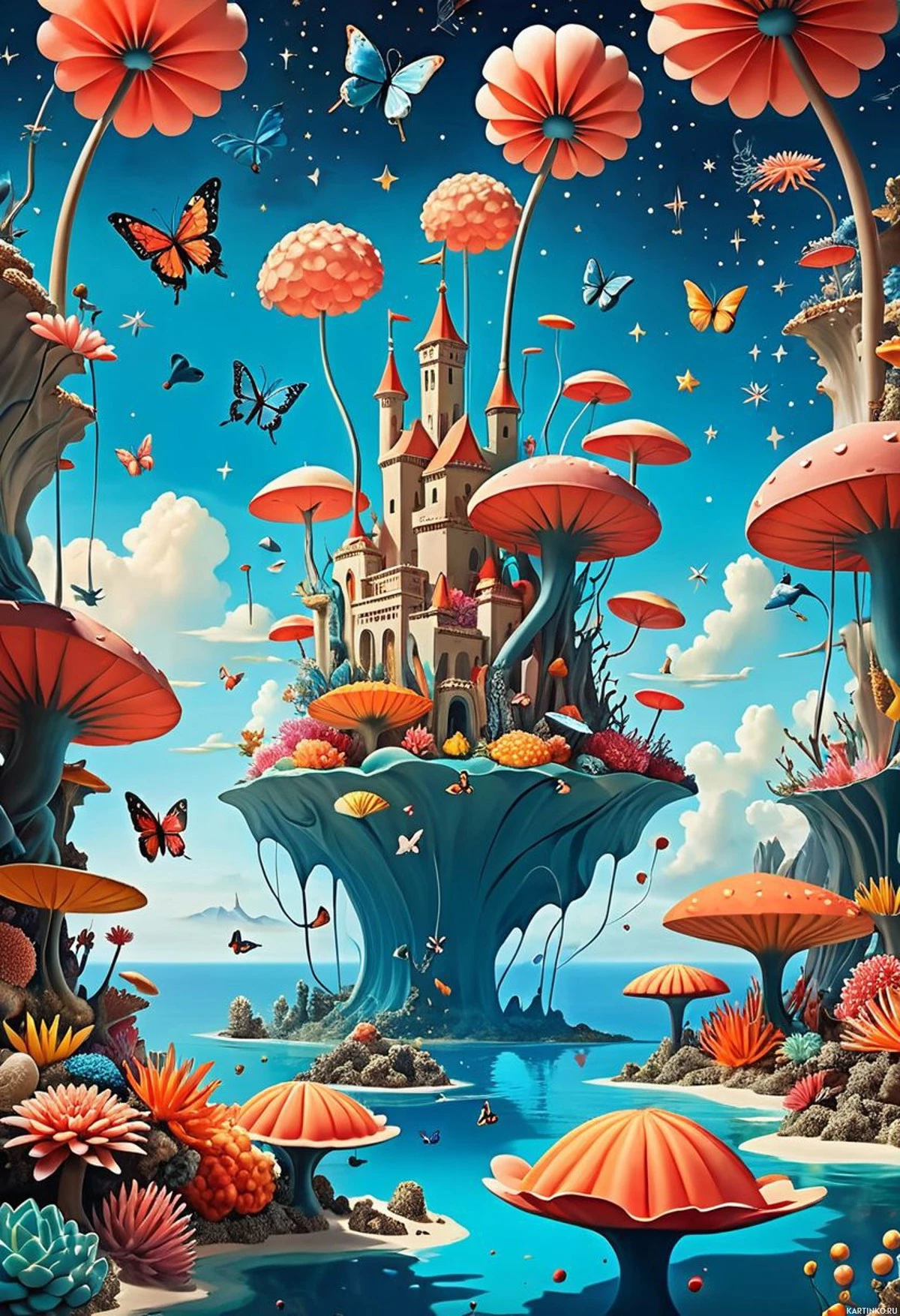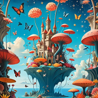 The image is a whimsical and vibrant fantasy illustration. At the center of the image, there's an enchanted
