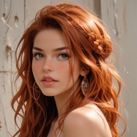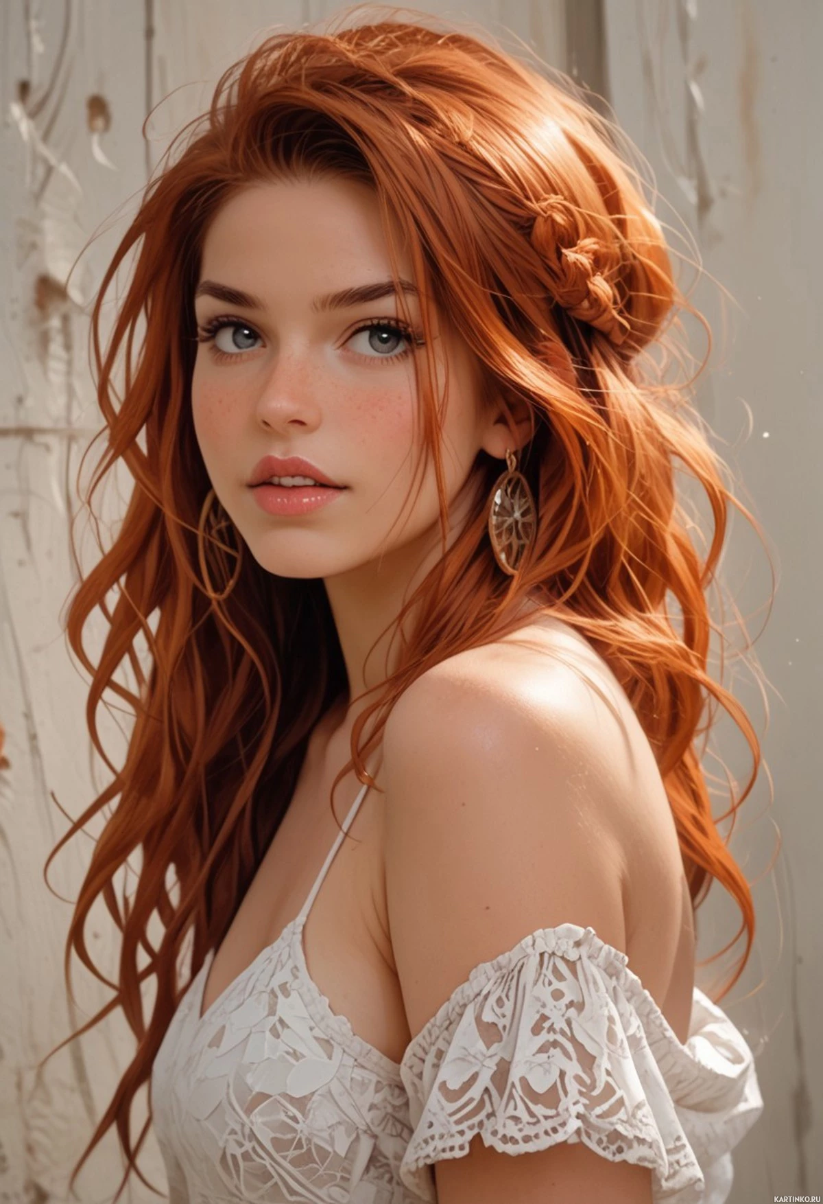 На картинке запечатлена молодая женщина с рыжими волосами, заплетенными в косу, с макияжем, подчеркивающим ресницы и сдержанным оттенком губ. Она смотрит немного в сторону с невозмущенным выражением лица. На ней кружевной топ с пышными рукавами. Ее поза говорит о том, что она, возможно, позирует для фотографии, что видно по ее руке, опирающейся на деревянную поверхность – возможно, часть внутренней стены или панели. Освещение мягкое и естественное, создающее спокойную и элегантную атмосферу.
