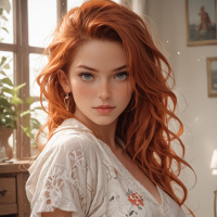 На картинке – молодая женщина с яркими рыжими волосами и светлой кожей. На её лице спокойное выражение, она смотрит прямо в камеру. Фон мягко подсвечен, видны предметы мебели и декор, что указывает на интерьер, возможно, комната в доме или люкс отеля. На ней светлый топ с едва заметным принтом, возможно, цветочным или растительным, и более темные брюки.