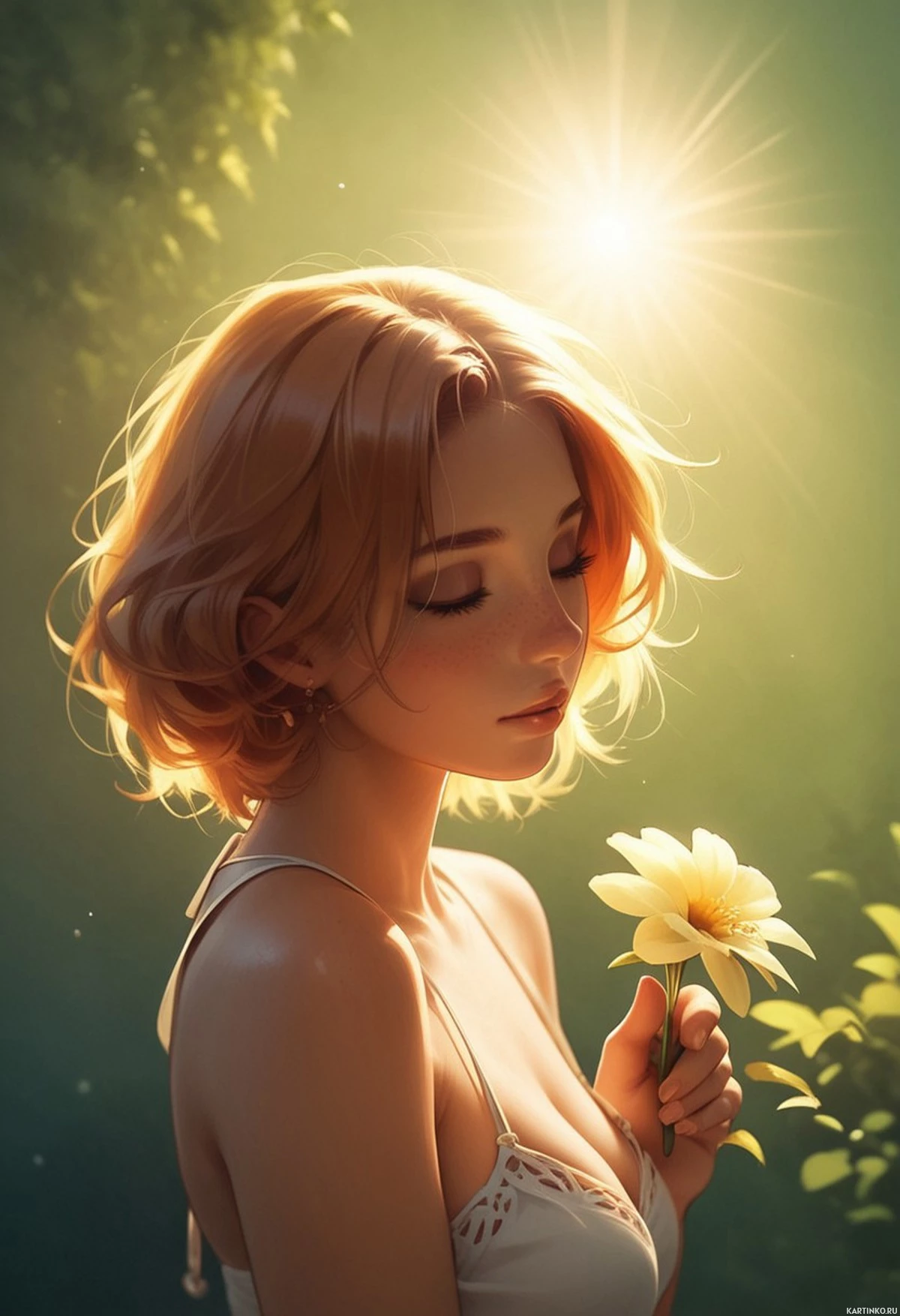 A young woman with blonde hair, wearing a transparent top with lace detailing and looking down at the flower she's holding in her hand. Her eyes are closed and she has a serene expression on her face. The background suggests a mystical or dream-like setting with sunlight filtering through foliage.