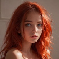 На картинке изображена женщина с ярко-рыжими волосами, уложенными мягкими волнами, которые ниспадают на плечи и грудь. У нее светлый тон кожи и чистая, ровная кожа. Она смотрит прямо в камеру с нейтральным выражением лица. Сквозь кадр пробивается солнечный свет, отбрасывающий тени на лицо и шею, что позволяет предположить, что фотография была сделана либо в конце дня, либо вечером. На ней полупрозрачный наряд, открывающий часть груди, с кружевной отделкой вокруг воротника.