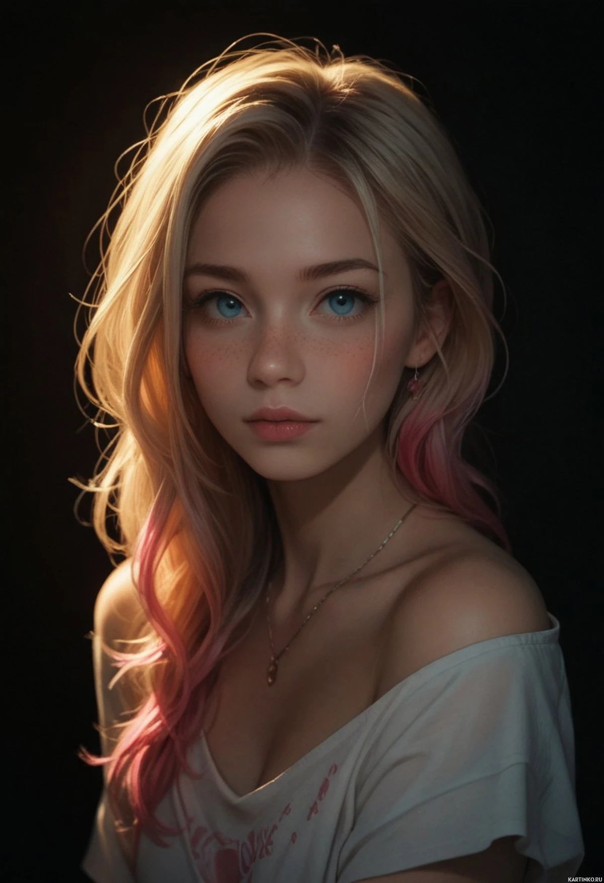На картинке запечатлена молодая женщина с светлыми волосами и голубыми глазами. У нее светлый оттенок кожи, с лёгким румянцем на щеках, возможно, благодаря макияжу, подчеркивающему черты лица. Она смотрит прямо в камеру с нейтральным выражением лица. Её причёска включает челку, падающую на один глаз, и локоны, обрамляющие лицо. Освещение на фотографии создаёт выразительный контраст между цветом кожи и размытым тёмным фоном. На ней свободный топ, открывающий живот. У топа неровный подол, частично прикрывающий живот. На шее, кажется, у неё ожерелье с подвеской или кулоном. Одежда и общий стиль картинки указывают на современное, возможно, дерзкое влияние в моде.