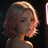 На картинке молодая девушка, снятая со спины. У неё с чёлкой, волосы с розовым оттенком – возможно, она покрасила их или использовала временный краситель. Она смотрит в сторону с невыразительным лицом. Свет подчёркивает её профиль, создавая ощущение глубины в фотографии. На заднем плане, кажется, комната, освещённая красным светом, создающим мягкое свечение позади неё.