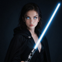The image depicts a female character with dark hair holding a lightsaber and wearing a black garment that resembles attire typically associated with the Star Wars franchise. Her expression is serious, and she appears to be looking directly at the camera. The lighting in the image gives it a dramatic effect.