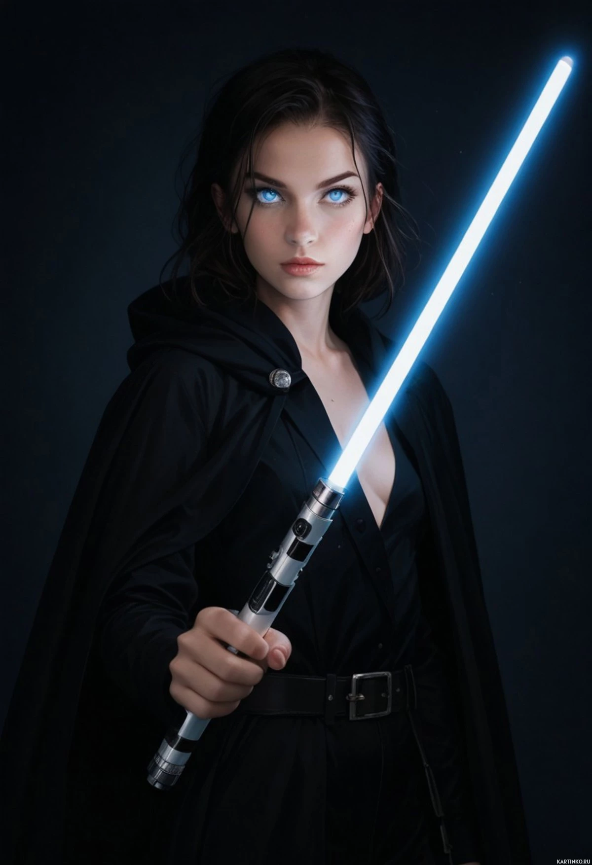На картинке изображена девушка с темными волосами, держащая световой меч и одетая в черный наряд, напоминающий костюмы из вселенной Звездных войн. У нее серьезное выражение лица, и она смотрит прямо в камеру. Освещение придает картинке драматический эффект.