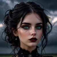 The image features a person posing in front of a cloudy sky with patches of blue and orange hues, suggesting either dawn or dusk. The individual has dark hair styled in an updo and is wearing makeup that accentuates their eyes, which are highlighted by the lighting. They have defined eyebrows and lips painted a shade of red. The person is dressed in attire that resembles a steampunk or gothic fashion style with a corset top featuring a lace-up design at the front. There appears to be jewelry worn around the neck, possibly representing some sort of accessory or emblem. The clothing has an intricate design, which could indicate a specific character or theme within a narrative context. The style of the image is realistic with dramatic lighting that casts shadows on the face and upper body of the subject.