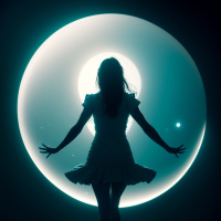 The image features a female figure standing with her arms outstretched to either side of her body, positioned in front of an illuminated circular structure that resembles a halo or aura. She is wearing a sleeveless dress and a dark skirt. Her silhouette is accentuated by the bright lighting that contrasts with the darkness around her, giving her figure a dramatic effect. The overall style of the image suggests a conceptual or artistic quality.