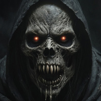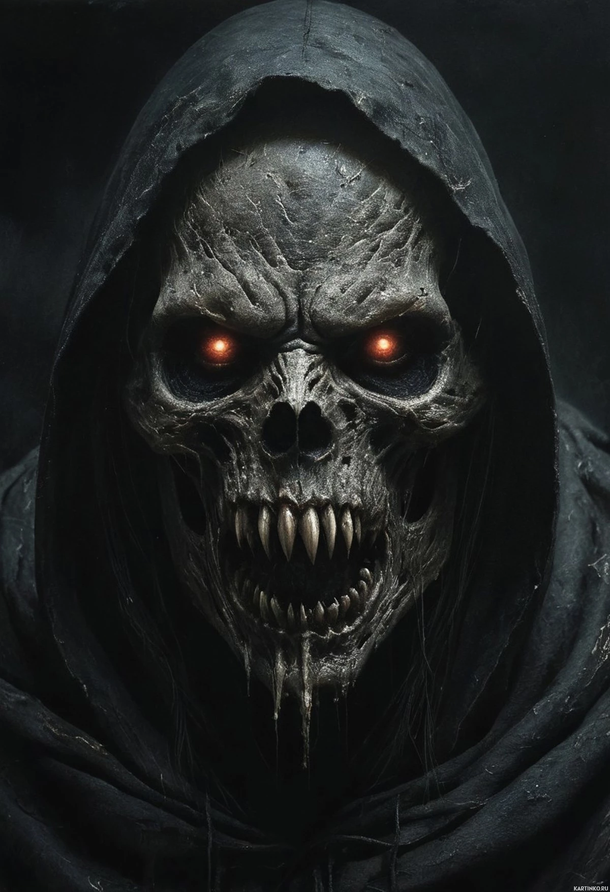 На картинке изображён персонаж, похожий на череп, с выражением агрессии и угрозы: горят красные глаза, зубы оскалены в злобной гримасе. Череп покрыт тёмными, грязными разводами, на голове накинут капюшон. Сверху, над глазами, до подбородка стекают полосы крови или другой тёмной жидкости. На заднем плане – тёмный фон с текстурой, напоминающей камень или твёрдую поверхность.