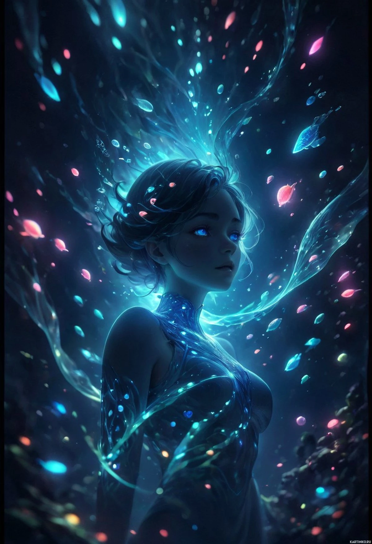 На картинке изображена женская фигура на фоне ночного неба, освещенного разноцветными, неземными огнями и, кажется, падающими листьями синих и пурпурных оттенков. На её лице – задумчивое выражение, взгляд направлен вверх, полный напряжённости. Одежда включает в себя мерцающие, металлизированные элементы, создающие впечатление доспехов. Общий стиль картинки иллюстративный, и её можно охарактеризовать как фэнтези или научно-фантастическое искусство.