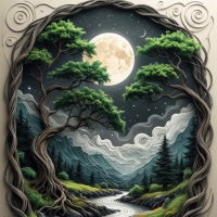 the night sky, their silhouettes faintly illuminated by the moonlight. The colors used in the artwork are predominantly cool and muted, with greens and blues dominating the palette, which contributes to a serene and peaceful atmosphere.