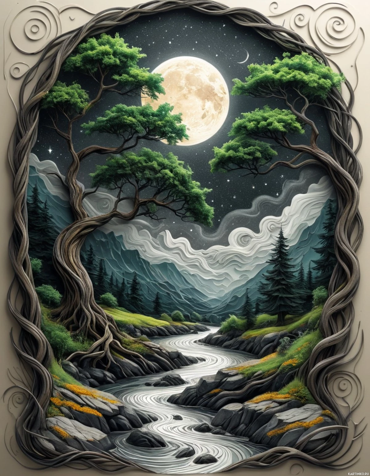 nighttime scene within an ornate picture frame. The artwork showcases a winding stream that meanders through