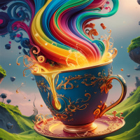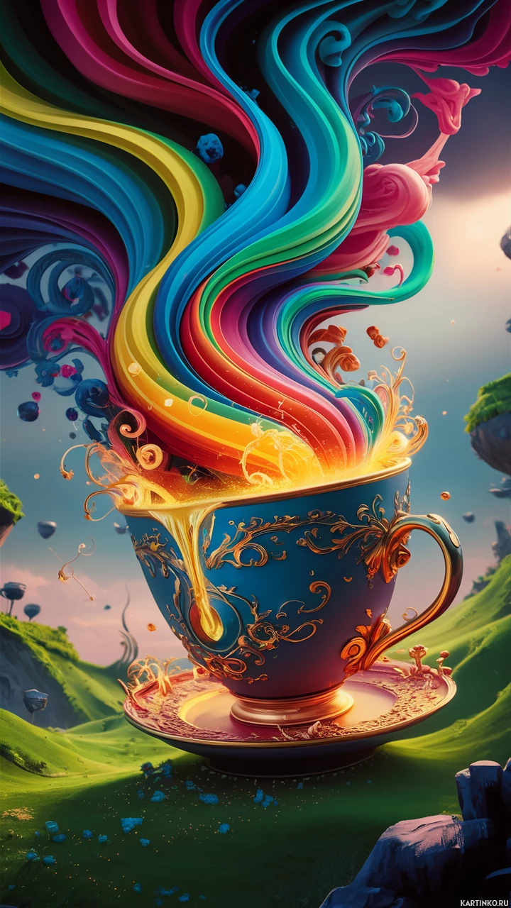 Картинка показывает фантастическую сцену с огромной чашкой для чая, которая кажется переполненной яркой разноцветной жидкостью, похожей на магму или лаву. Из чашки выплескиваются струи цветов, напоминающие фейерверк или, возможно, взрыв энергии. На заднем плане — ярко освещенное небо с облаками, подсвеченными небесными светилами, что создает ощущение рассвета или заката. У основания чашки из земли пробился маленький зеленый росток. Земля кажется мягким лугом с разбросанными камнями и пятнами снега, указывающими на прохладный климат. Стиль работы — сюрреалистичный и причудливый, объединяющий элементы, которые обычно не сочетаются: чашка для чая и огненный взрыв красок.
