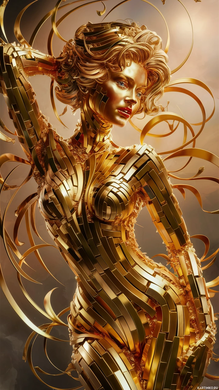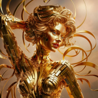 The image features a digitally created artwork of a woman. She is dressed in an ornate outfit that appears to be made entirely of gold or golden-colored material, with