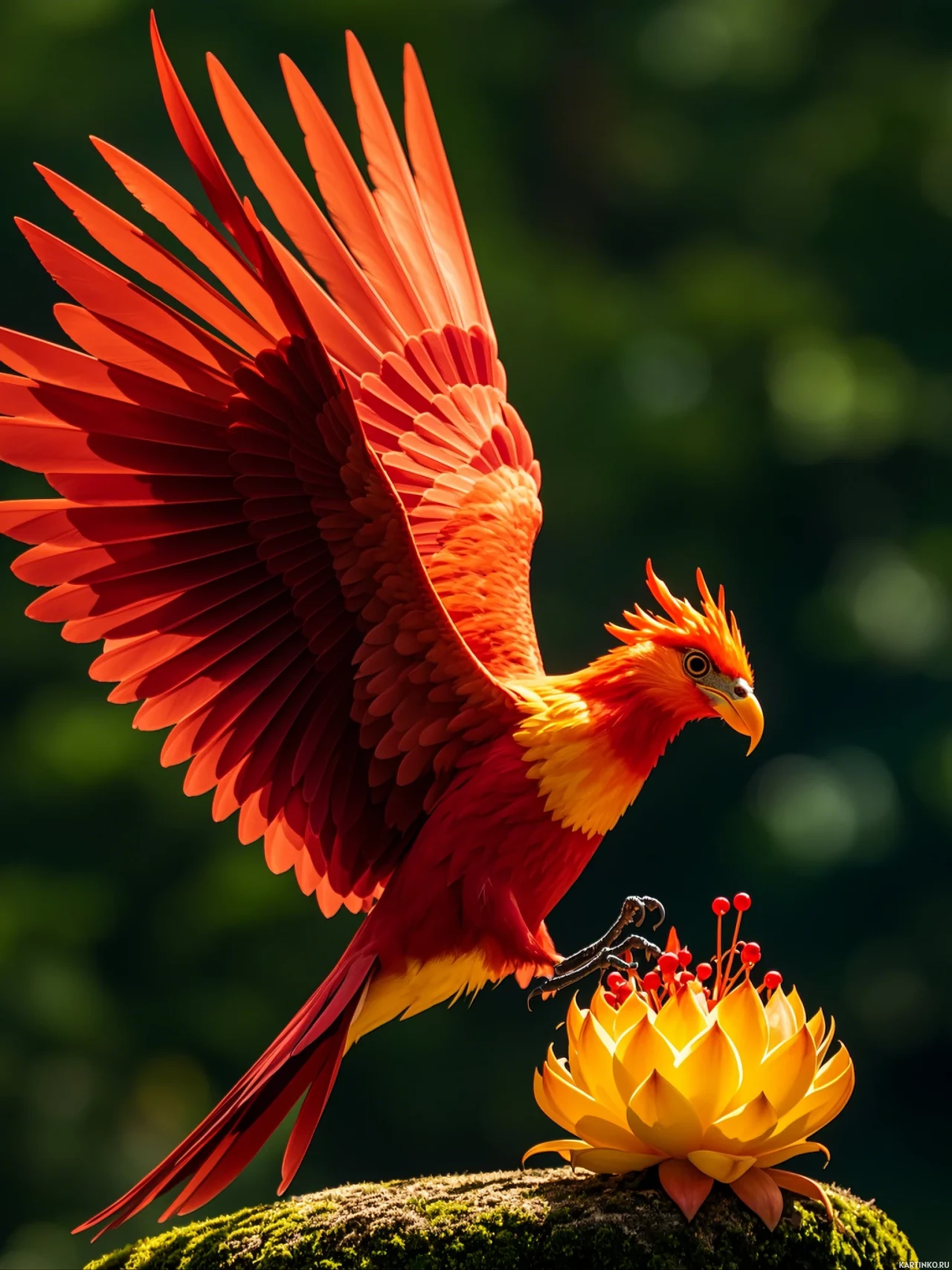 Картинка изображает кардинала с красной тупой макушкой, сидящего на камне с широко расправленными крыльями в демонстрационной позе. Рядом с ним растет оранжевый и жёлтый цветок, похожий на лотос. Фон размытый, создаёт впечатление естественного окружения, возможно, джунглей или леса.