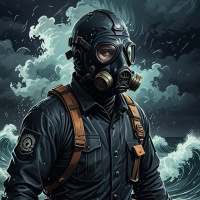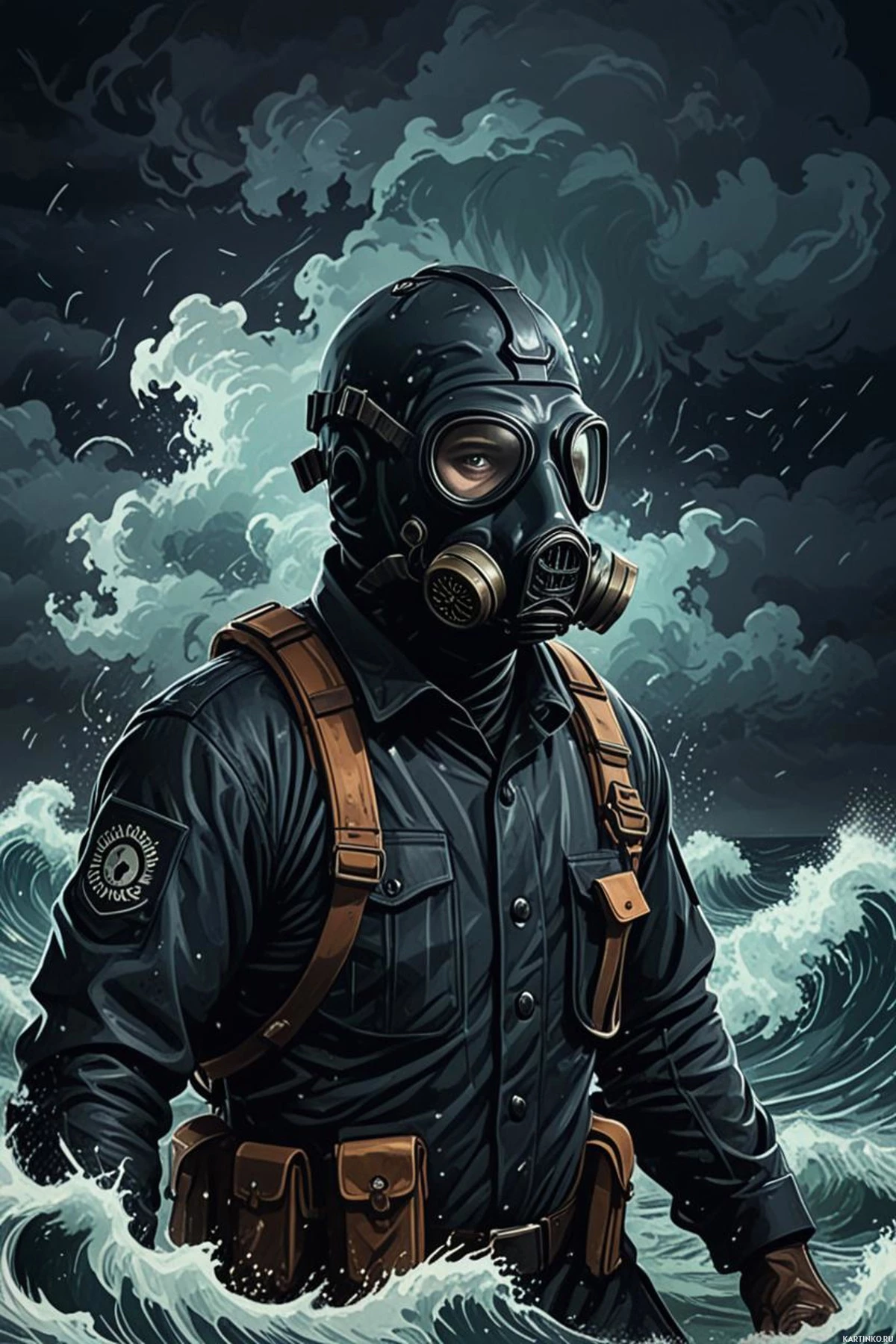 an illustrated character who appears to be a man wearing a respirator mask. He has