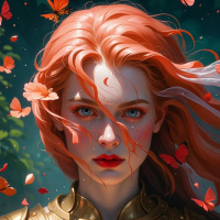 The image features a young woman with red hair and striking blue eyes. She has subtle makeup that accentuates her natural beauty, particularly around the eyes which are rimmed in a dark shade that contrasts with the rest of her face. Her lips have a hint of color, possibly matching her eyes, and she appears to be wearing some form of protective or combat-ready gear, including what could be interpreted as armor or a helmet on her head. The butterflies are depicted in mid-flight around the woman's face, creating an ethereal and dreamlike quality to the image. The surrounding elements appear to be composed of floral motifs, with greenery and what could be interpreted as flowers or leaves adding a naturalistic backdrop to the portrait. The style of the picture suggests it might be a digitally created artwork, given the stylized elements and the fantastical aspects present, such as the butterflies and the armor.