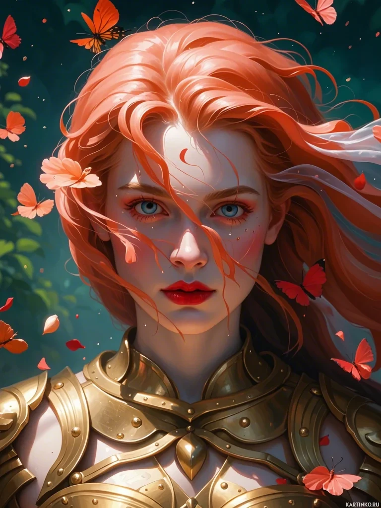 На картинке запечатлена молодая женщина с рыжими волосами и выразительными голубыми глазами. У неё легкий макияж, подчеркивающий её естественную красоту, особенно в области глаз, обрамленных темным контуром, контрастирующим с остальным лицом. На губах легкий оттенок, возможно, в тон глазам, а на голове она словно носит защитное снаряжение, похожее на доспехи или шлем. Вокруг лица женщины изображены бабочки в полете, создавая вокруг нее неземную, сказочную атмосферу. Окружающие элементы словно составлены из цветочных мотивов, а зелень и что-то вроде цветов или листьев создают естественный фон для портрета. Стиль картинки указывает на то, что это, возможно, цифровая работа, учитывая стилизованные элементы и фантастические детали, такие как бабочки и доспехи.