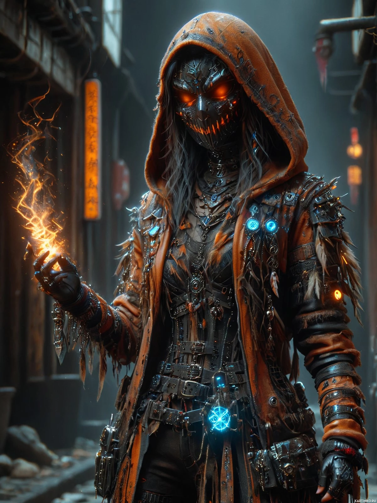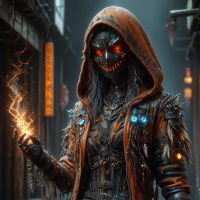 hooded cloak with metal accents and intricate detailing. In her hands, she holds a staff topped with what appears to be an electric-like energy or sparks. The character has spiky, messy