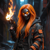 The image features a red-haired individual wearing a mask with glowing eyes and holding a weapon in one hand. They are dressed in a jacket with various straps and patches, along with what appears to be armor or a tactical vest. There is fire visible near the individual's face. The setting suggests an urban environment at night, possibly an alleyway.