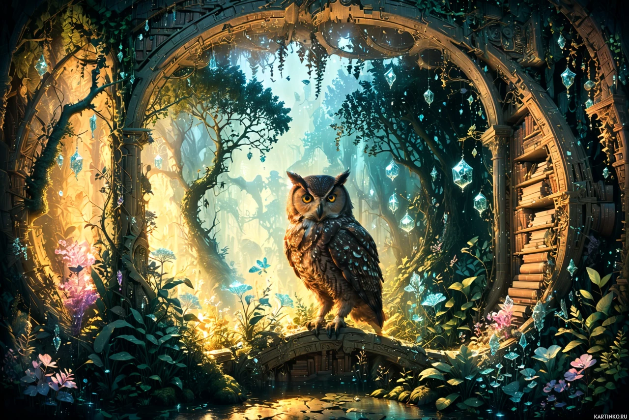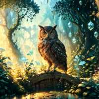 a fantastical scene with an owl as the central figure. The owl is perched on what appears to be a tree branch that overhangs a lush
