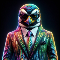 The image features a stylized character that appears to be inspired by both human and penguin traits. It has a torso and arms of a person wearing a suit with a shirt, tie, and sunglasses. The character's head resembles a penguin with a large black eye patch covering one eye, a prominent black beak, and the classic black and white pattern on its head and neck. It is standing upright against a dark background with colorful specks of light around it, which adds to the surreal and artistic quality of the image.