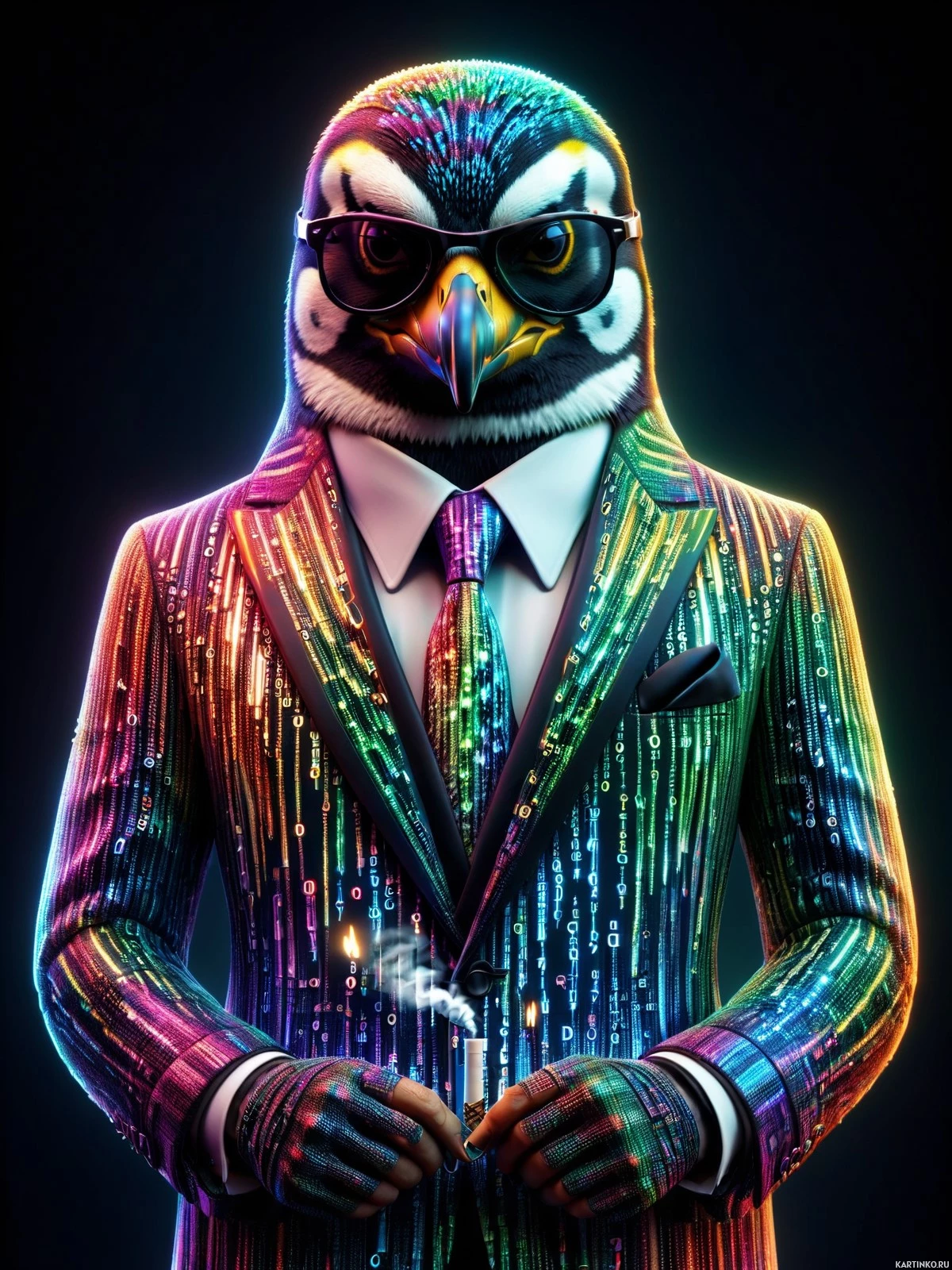 На картинке изображен стилизованный персонаж, сочетающий черты человека и пингвина. У него торс и руки, как у человека в костюме: рубашка, галстук и солнцезащитные очки. Голова напоминает пингвина с большой черной повязкой на одном глазу, заметным черным клювом и характерным черно-белым узором на голове и шее. Он стоит прямо на темном фоне, окруженный разноцветными пятнышками света, что добавляет картинке сюрреалистичности и художественности.