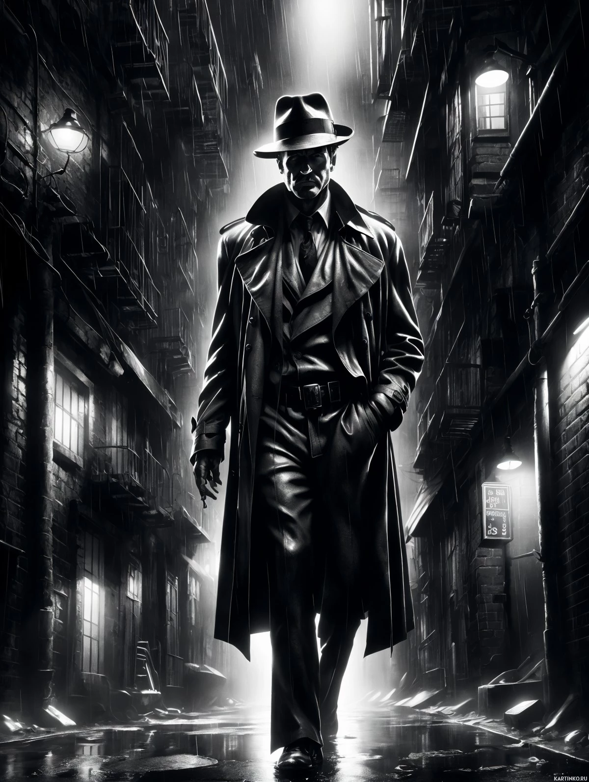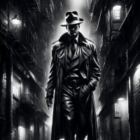 На картинке мужчина идёт по мокрой ночью улице. На нём тёмное пальто и шляпа, что придаёт ему таинственный вид. Лица не видно из-за темноты, но в правой руке он держит трость, что может говорить о его возрасте или, возможно, это оружие. Мокрый булыжник отражает свет, усиливая нуарную атмосферу. На заднем плане – высокие здания с тёплыми огнями в окнах, контрастирующими с общей мрачностью. Кажется, что картинка запечатлела напряжённый момент, полный ожидания.